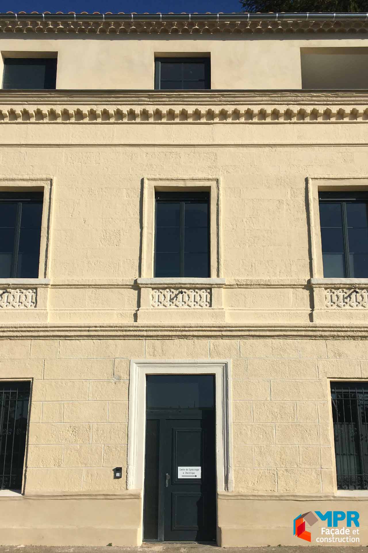Ce projet, conçu et coordonné par l’architecte Jérôme Brément, consistait en la restructuration et l’agrandissement d’un hôtel particulier du XIXe siècle en un centre d’obstétrique. 3 missions ont été confiées à MPR façade : restaurer la façade historique donnant sur l’avenue Carnot, appliquer des enduits sur le rehaussement et les faces arrière, enfin créer un nouveau réseau de canalisation des eaux pluviales. Pour ce faire un gommage doux a été réalisé sur la façade en pierre fortement taguée, certains éléments en pierre ont été reconstitués et un badigeon à la chaux a été appliqué ; les façades côté arrière ont été décroutées et réenduite ; enfin le réseau d’écoulement des eaux pluviales a été repensé et réalisé en zinc français.