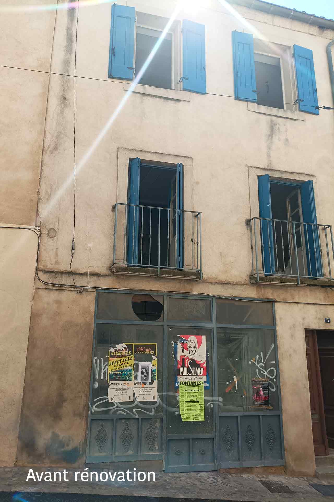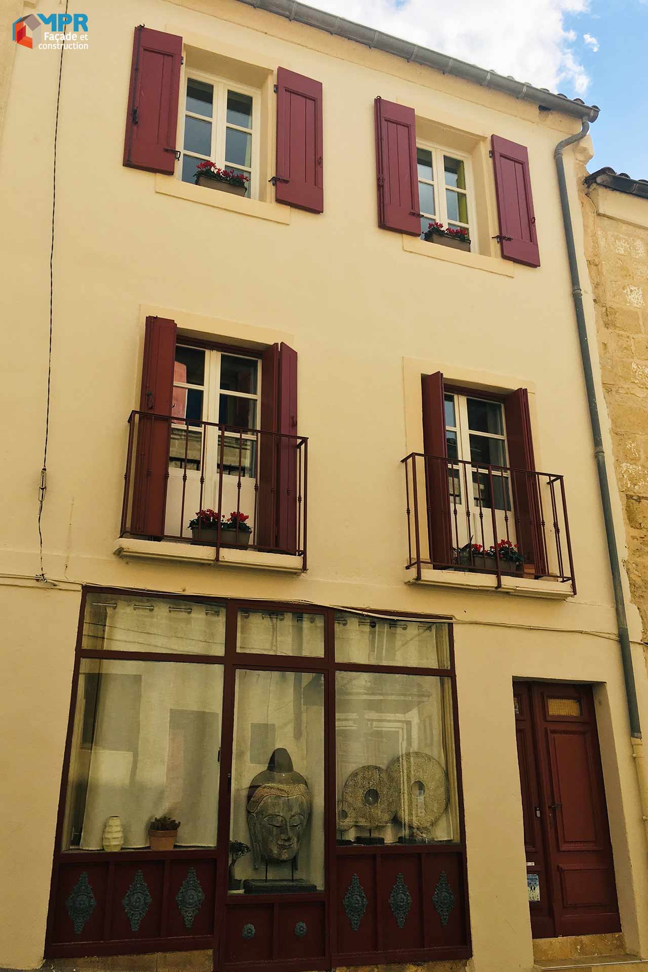 Cette opération correspond à ce que nous appelons une rénovation douce. En effet l’enduit existant étant plus encrassé qu’abimé, aucune restauration profonde n’était nécessaire. Hors quelques points qui demandaient des interventions techniques (sous-faces bois des balcons à reconstituer), notre travail a consisté à nettoyer à l’eau la façade puis la repeindre avec un enduit fin à base de silicate de potassium également appelé peinture minérale. Deux tons ont été choisis pour la façade et les encadrements. Selon les recommandations des Bâtiments de France, les ferronneries et volets ont été peints en rouge de Sommières.
