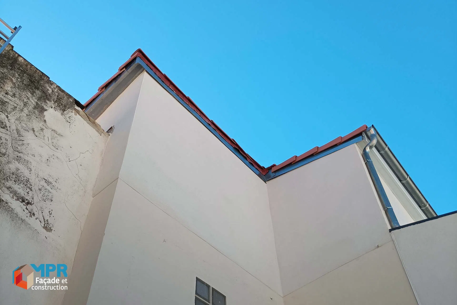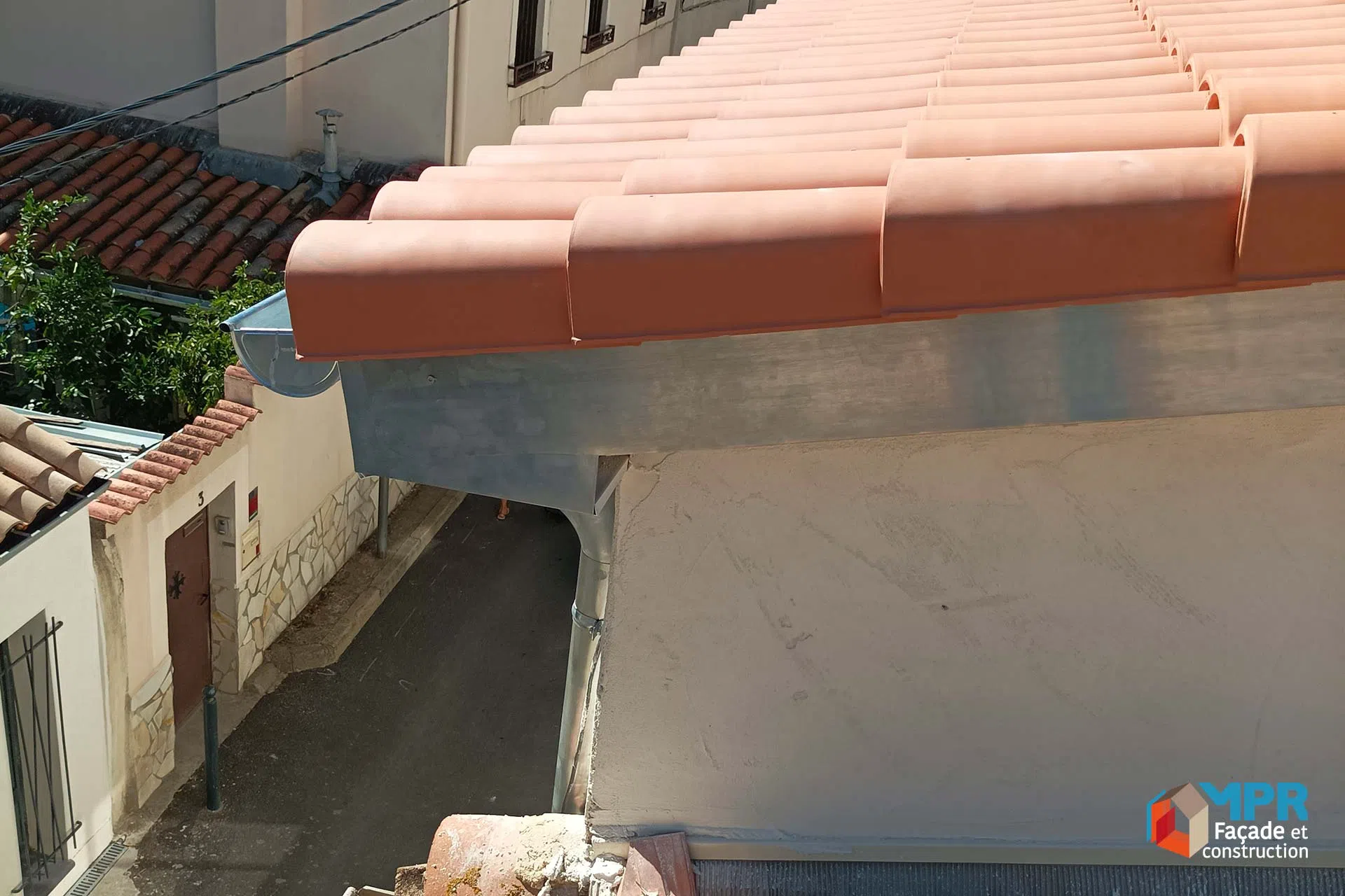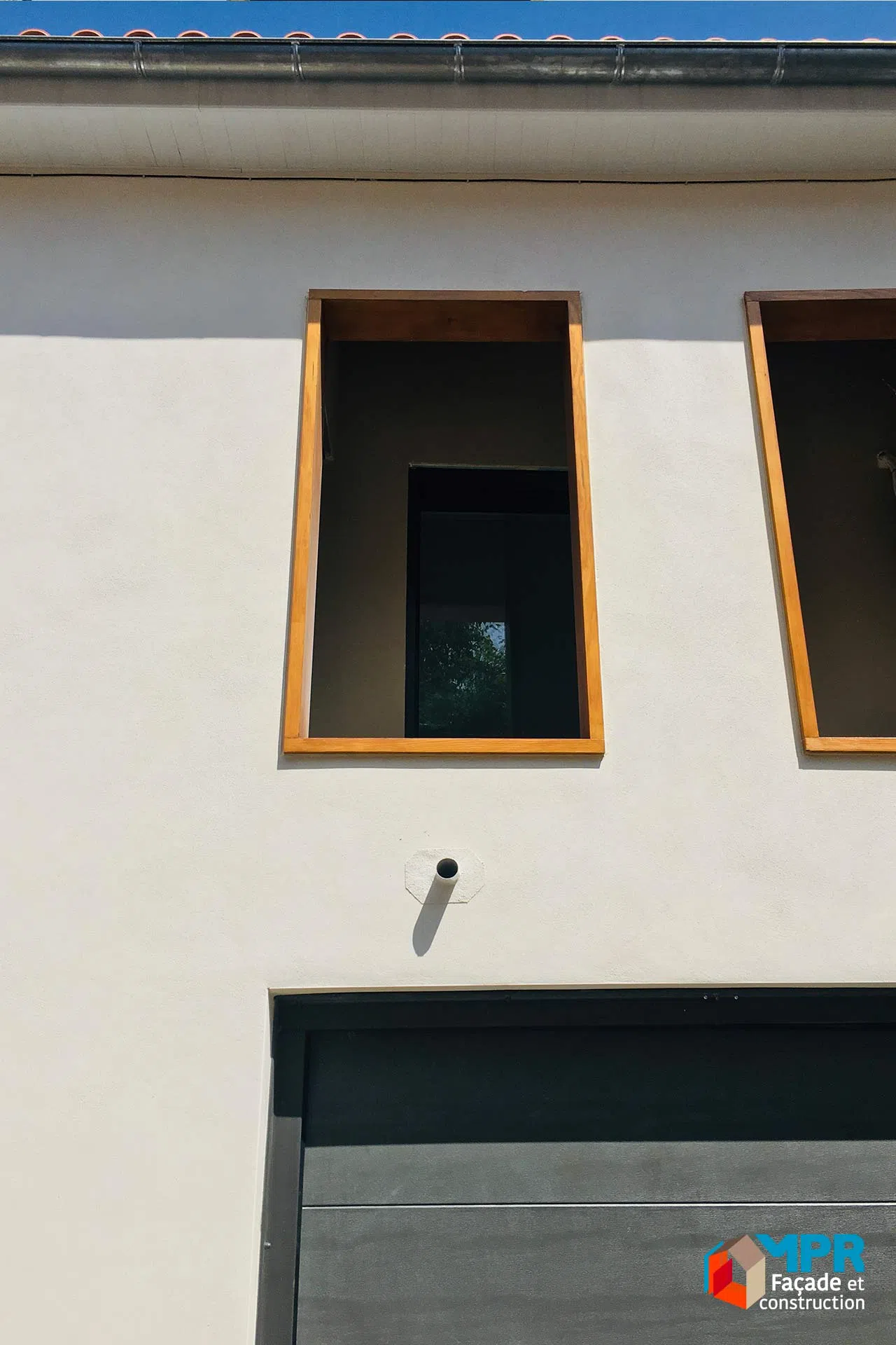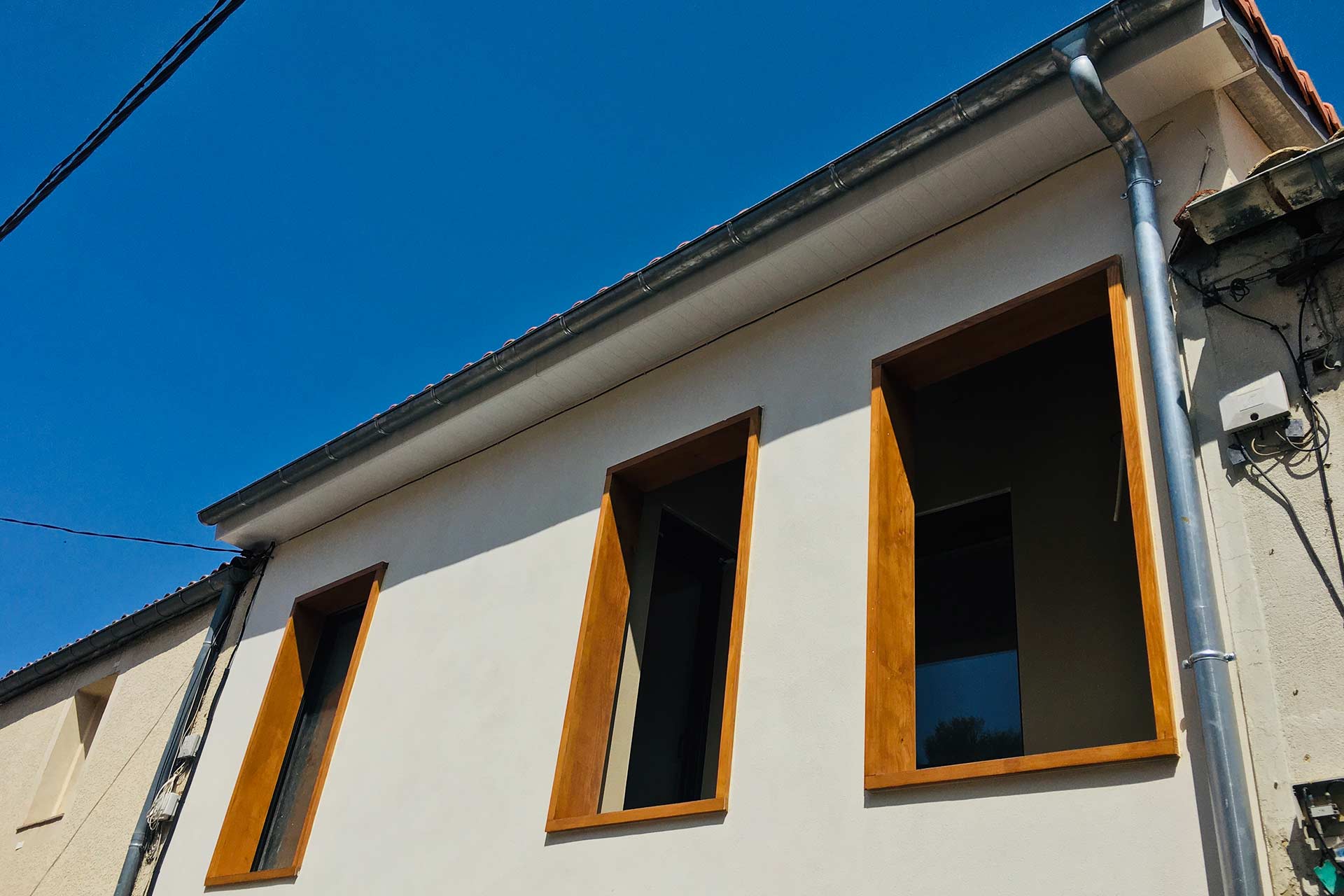 Dans le quartier Boutonnet de Montpellier, cette maison a été restructurée par un architecte pour gagner en surface et fonctionnalité. Nous y avons réalisé 4 missions. Des enduits monocouche sur les façades, surélévation (couleur G20, blanc cassé) et dans la loggia (couleur T30, terre d’argile). Une étanchéité de terrasse avec dalles sur plots pour la petite loggia. Des débords de toiture en PVC. Et de multiples ouvrages de zinguerie (gouttières, descentes d’eau pluviales, habillage zinc des panneaux sandwich en rive, solins, entablements…).